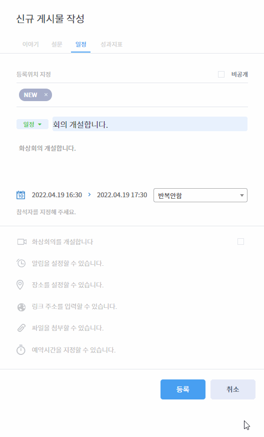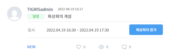 일정 작성 시 '화상회의를 개설합니다'에 체크✅하세요. 일정을 등록하면 피드에 공유되는 게시물에 [화상회의 참가] 버튼이 추가됩니다.