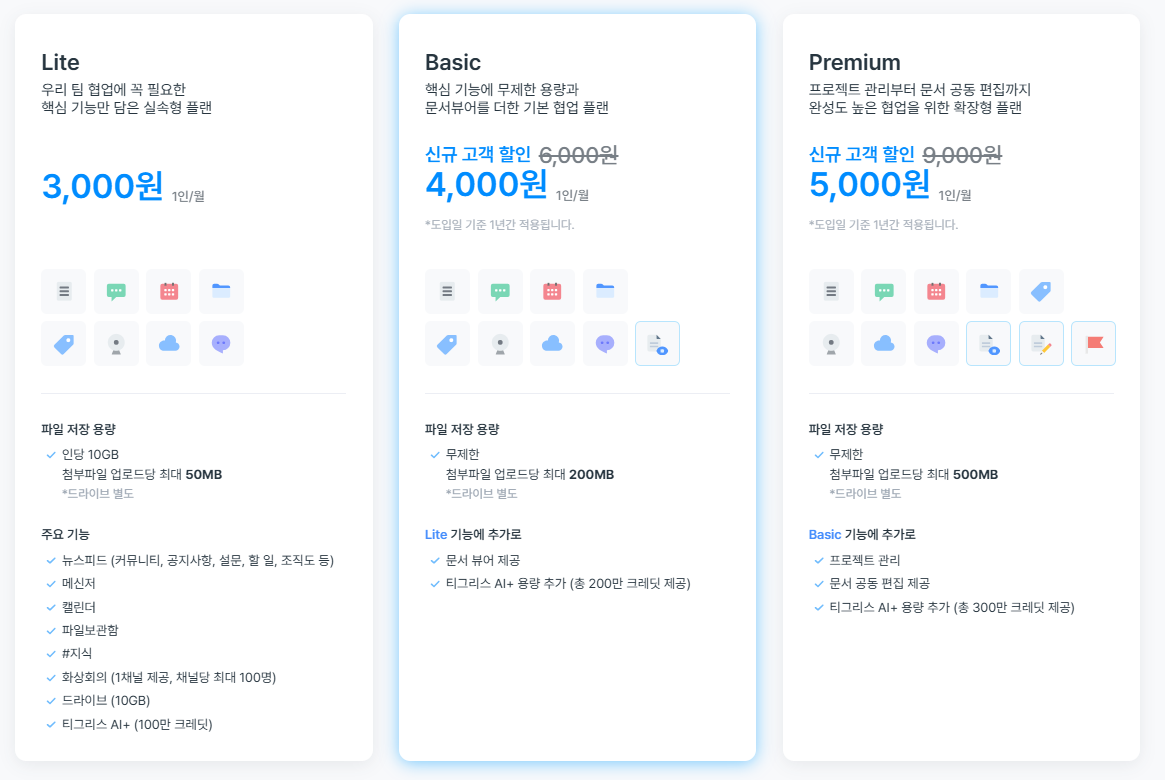우리 조직의 생산성을 높일 수 있는 방법! 티그리스 베이직, 프리미엄 요금제로 더 효율적인 협업 환경을 마련해보세요.