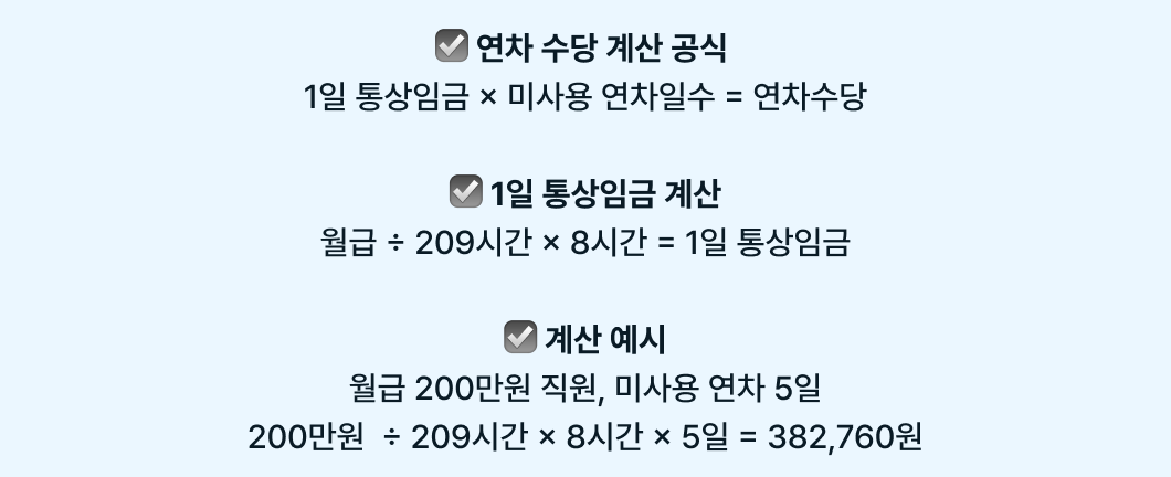 연차 수당과 1일 통상임금 계산 공식은 다음과 같습니다.