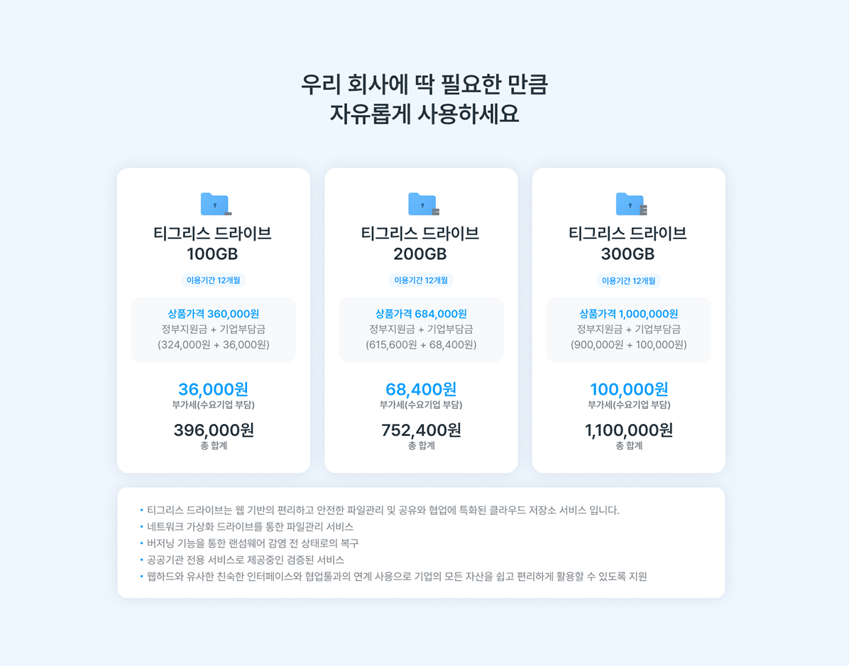 기업 규모 및 업무 특성에 따라 필요한 만큼만 비용을 지불하세요. 100GB부터 200GB, 300GB 총 세 가지 상품을 제공합니다.