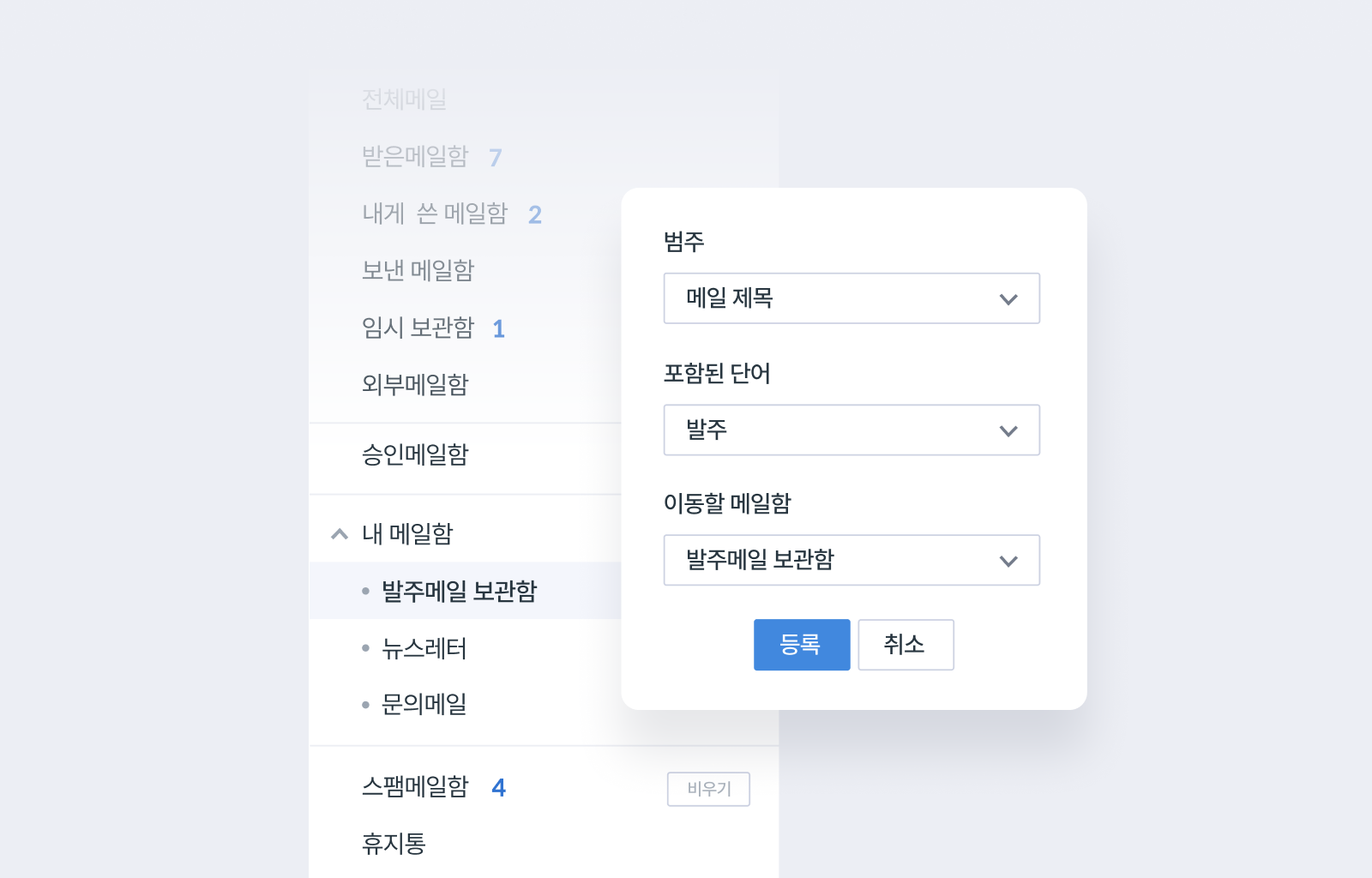 실제로 저는 전자결재와 이메일을 가장 많이 활용하고 있는데요. 발주서가 이메일로 들어오는 일이 많아 '발주'라는 키워드를 걸어서 메일함에 자동 분류해 주는 기능을 활용하고 있어요.