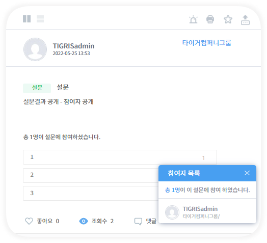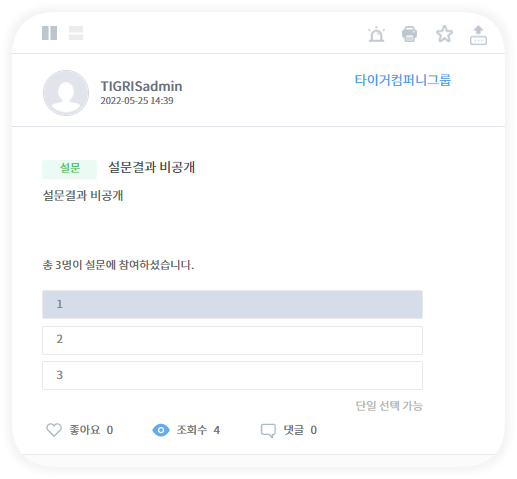 - 각 옵션을 선택한 설문 참여자 명단이 공개되지 않습니다. 관리자와 게시글 작성자도 누가 어떤 옵션을 선택했는지 알 수 없습니다.