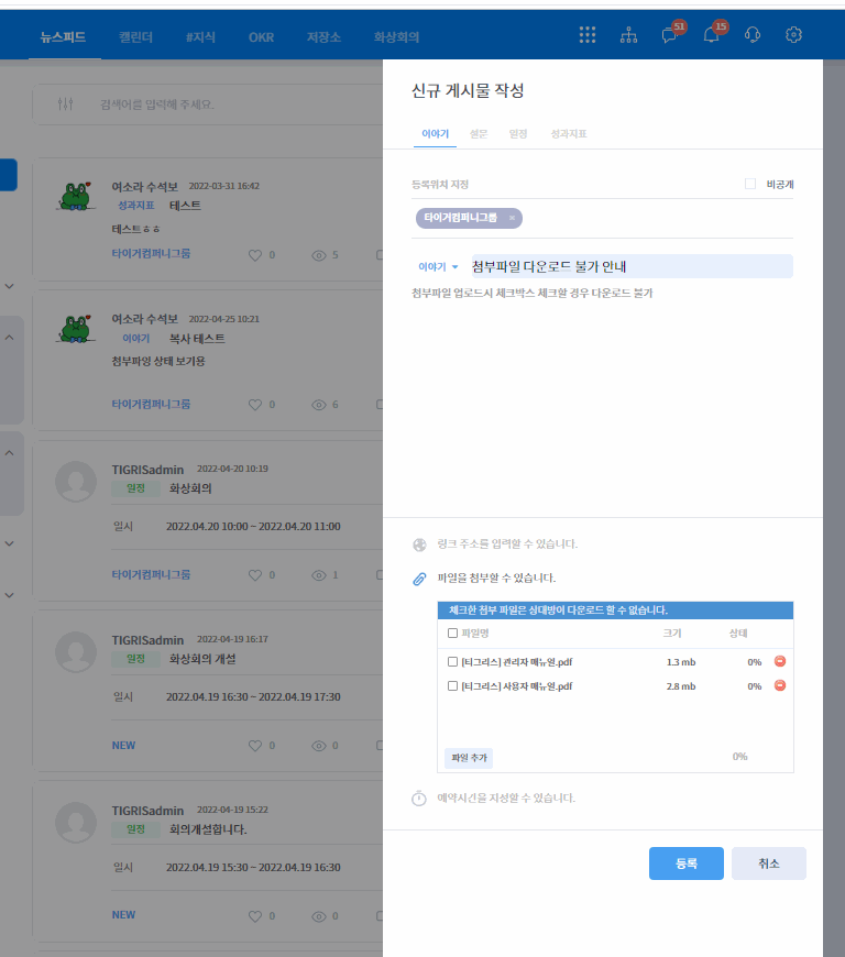 기존에는 글이나 댓글을 수정할 때 체크박스를 함께 변경할 수 있었는데요. 업데이트된 티그리스에서는 체크박스 수정이 불가능합니다. 대신 파일명에 체크한 후 글을 등록하면 다운로드 불가 안내 팝업 알림이 뜹니다. 실수로 파일 공유를 제한한 경우, 알림을 통해 체크박스를 다시 확인한 후 글을 등록하세요.
