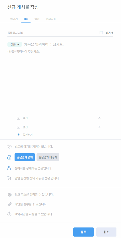 기존에는 설문 작성 시 참여자 공개 여부만 설정할 수 있었는데요. 이제 결과를 공개하지 않는 설문을 작성할 수 있습니다. [글쓰기] – [설문] 탭에서 달라진 옵션을 확인하세요.