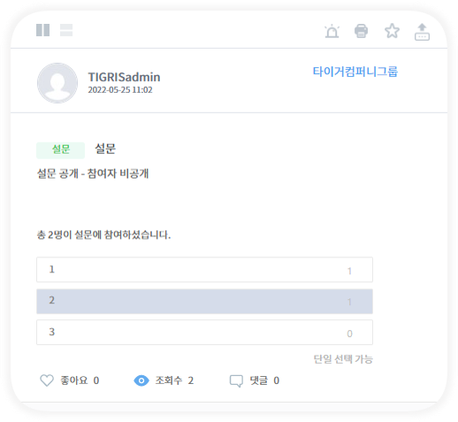 - 각 옵션을 선택한 설문 참여자 명단이 공개되지 않습니다. 관리자와 게시글 작성자도 누가 어떤 옵션을 선택했는지 알 수 없습니다.