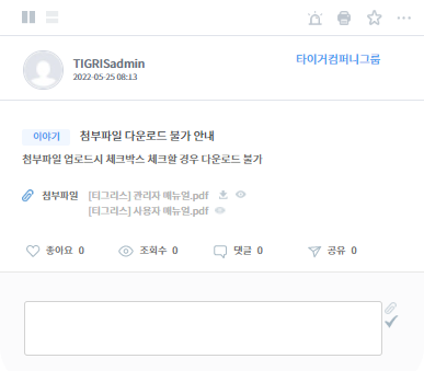 기존에는 글이나 댓글을 수정할 때 체크박스를 함께 변경할 수 있었는데요. 업데이트된 티그리스에서는 체크박스 수정이 불가능합니다. 대신 파일명에 체크한 후 글을 등록하면 다운로드 불가 안내 팝업 알림이 뜹니다. 실수로 파일 공유를 제한한 경우, 알림을 통해 체크박스를 다시 확인한 후 글을 등록하세요.