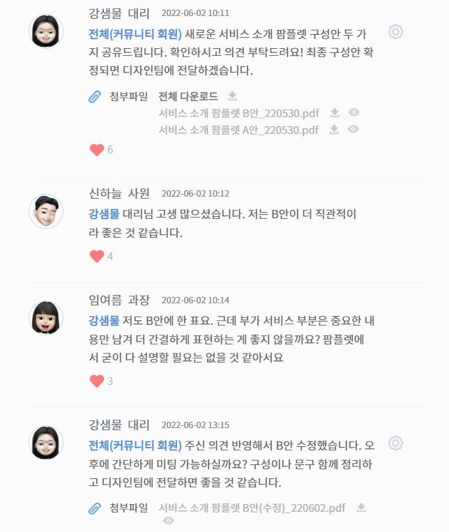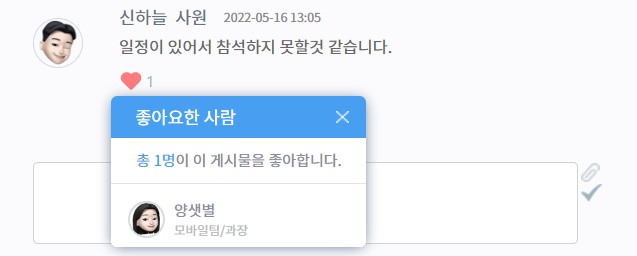 간단하게 확인 여부만 알리면 될 때, 좋아요(♡)를 눌러보세요. 좋아요를 클릭하면 상대방에게 알림이 나타납니다. 아이콘 옆 숫자를 클릭하면 좋아요한 사람의 명단도 확인할 수 있습니다.
