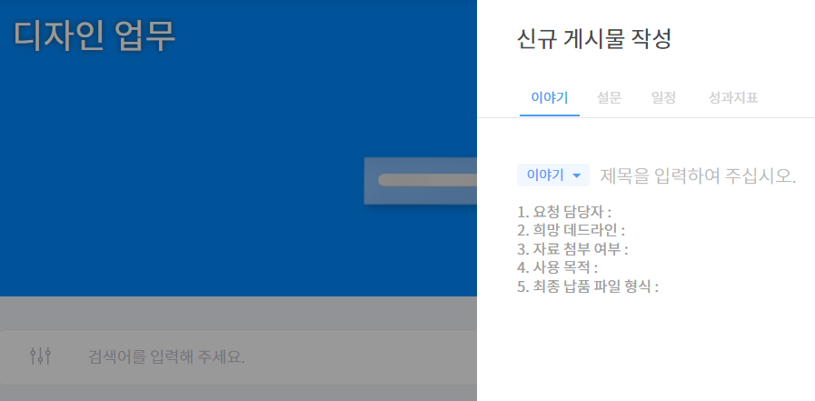 실제 티그리스 디자인팀은 '디자인 업무' 커뮤니티를 통해 협업하는데요. 양식을 미리 지정해 업무 요청을 받고 있습니다. 업무를 요청할 구성원이 글쓰기 버튼을 클릭하면 디자인팀이 지정한 양식이 뜹니다. 커뮤니티를 개설하고 양식을 지정한 후, 디자인팀의 일정 및 작업 관리가 더욱 수월해졌습니다. (※ 양식은 커뮤니티를 개설할 때 작성 가능합니다. 개설 후에는 커뮤니티 관리에서 수정할 수 있습니다.)