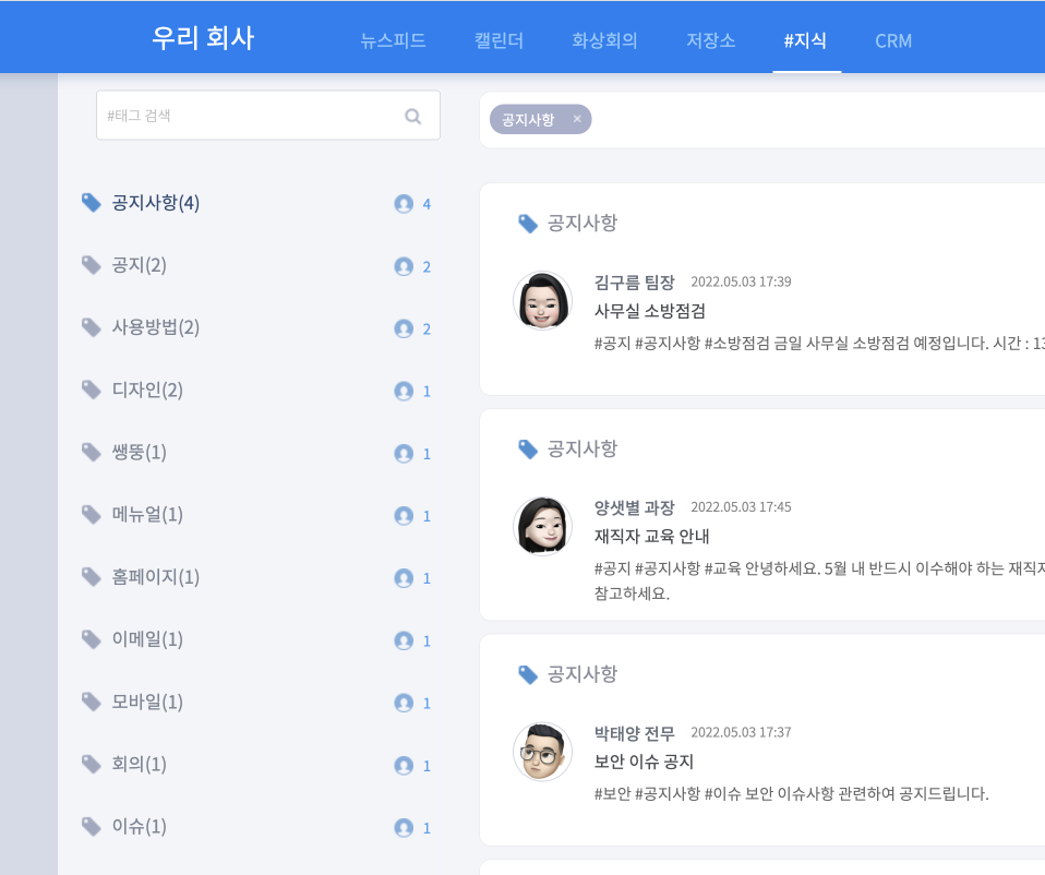 고객사 관리가 중요한 B2B 기업이거나 여러 파트너사와 협업하는 경우, 회사별 태그를 만들어 활용하는 것을 추천합니다. 해당 회사와 관련된 업무 기록을 #지식에서 한눈에 볼 수 있어 편리하거든요. 고객사 태그는 인수인계 시에도 유용한데요. 신규 입사자가 특정 고객사나 파트너사와 일해야 할 경우, #지식에서 해당 회사와 관련된 내용을 빠르게 파악할 수 있습니다.