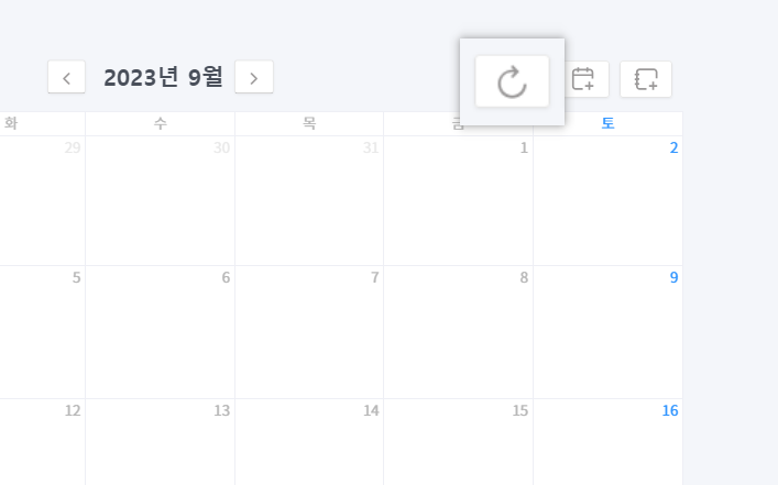 [새로고침] 아이콘은 캘린더 화면 오른쪽 상단의 3개 아이콘 중 첫 번째 아이콘입니다.