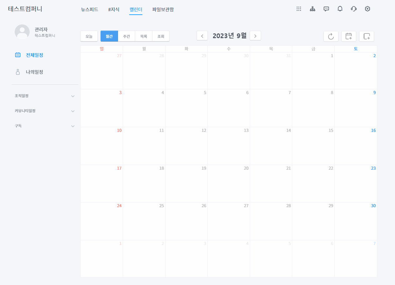 캘린더 화면은 [전체일정]을 기본값으로 보여줍니다. 캘린더 왼쪽 메뉴에서 [전체일정] 뿐 아니라 [나의일정]과 [조직일정], [커뮤니티일정], [구독] 과 같이 일정 유형별 조회가 가능합니다.