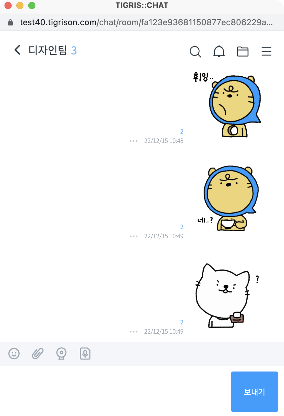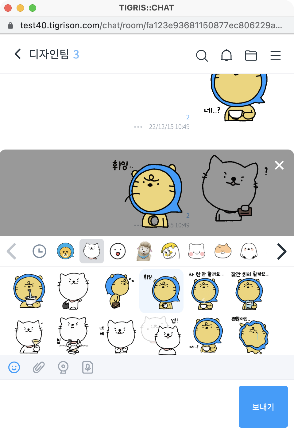올해 티그리스 만족도 조사에서 많은 분들께서 개선할 점을 말씀해 주셨는데요. 다양한 이모티콘을 사용하고 싶다는 의견도 많았습니다. '출근했습니다 코리모리' 이모티콘을 비롯해 소통에 즐거움을 더할 수 있는 다양한 이모티콘을 선보일 수 있도록 앞으로 더욱 노력하겠습니다.