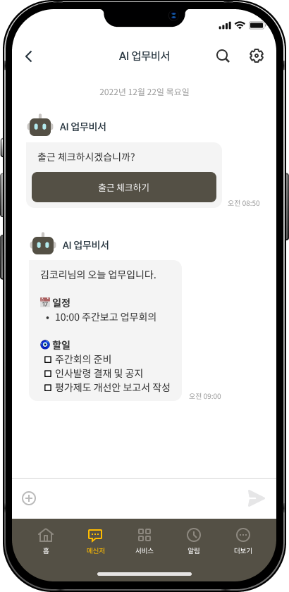 출퇴근 알림, 업무 처리 확인 등 챗봇 대화형 업무 비서 서비스