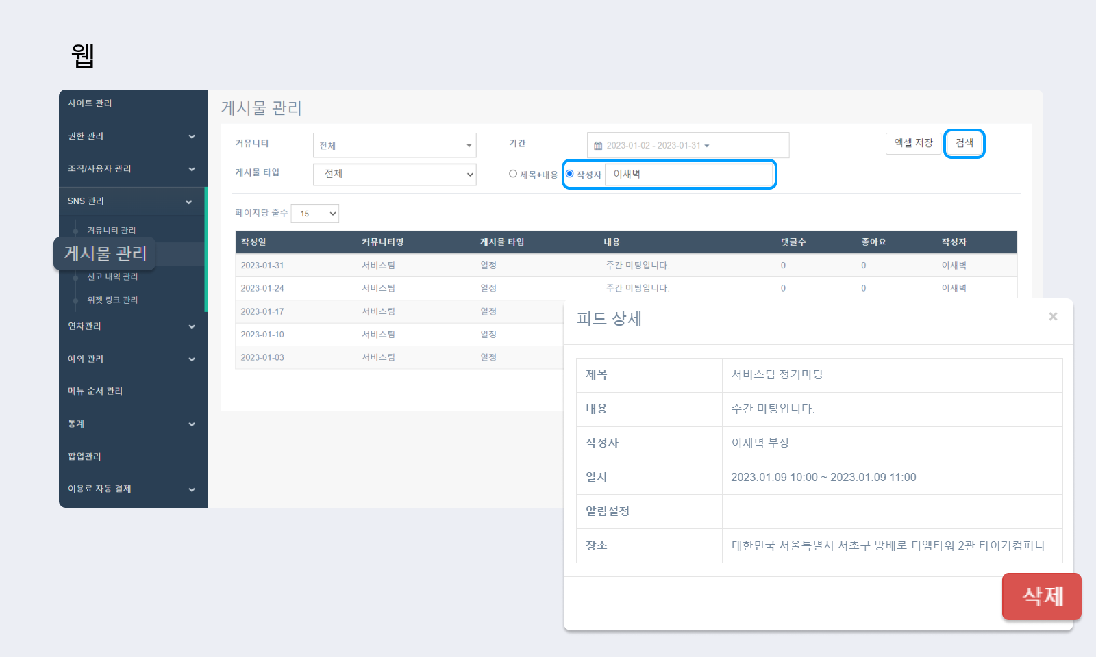 관리자는 [관리자메뉴] - [SNS 관리] - [게시물 관리]에서 게시물을 삭제할 수 있습니다. 퇴사자의 글을 삭제하고 싶은 경우, 게시물 관리 페이지 검색 필터 [작성자] 선택 - 이름을 입력하고 [검색] 버튼을 클릭하세요. 작성한 글이 나타나면 삭제할 글 선택 – [피드 상세]에서 오른쪽 하단의 [삭제] 버튼을 클릭하세요.
