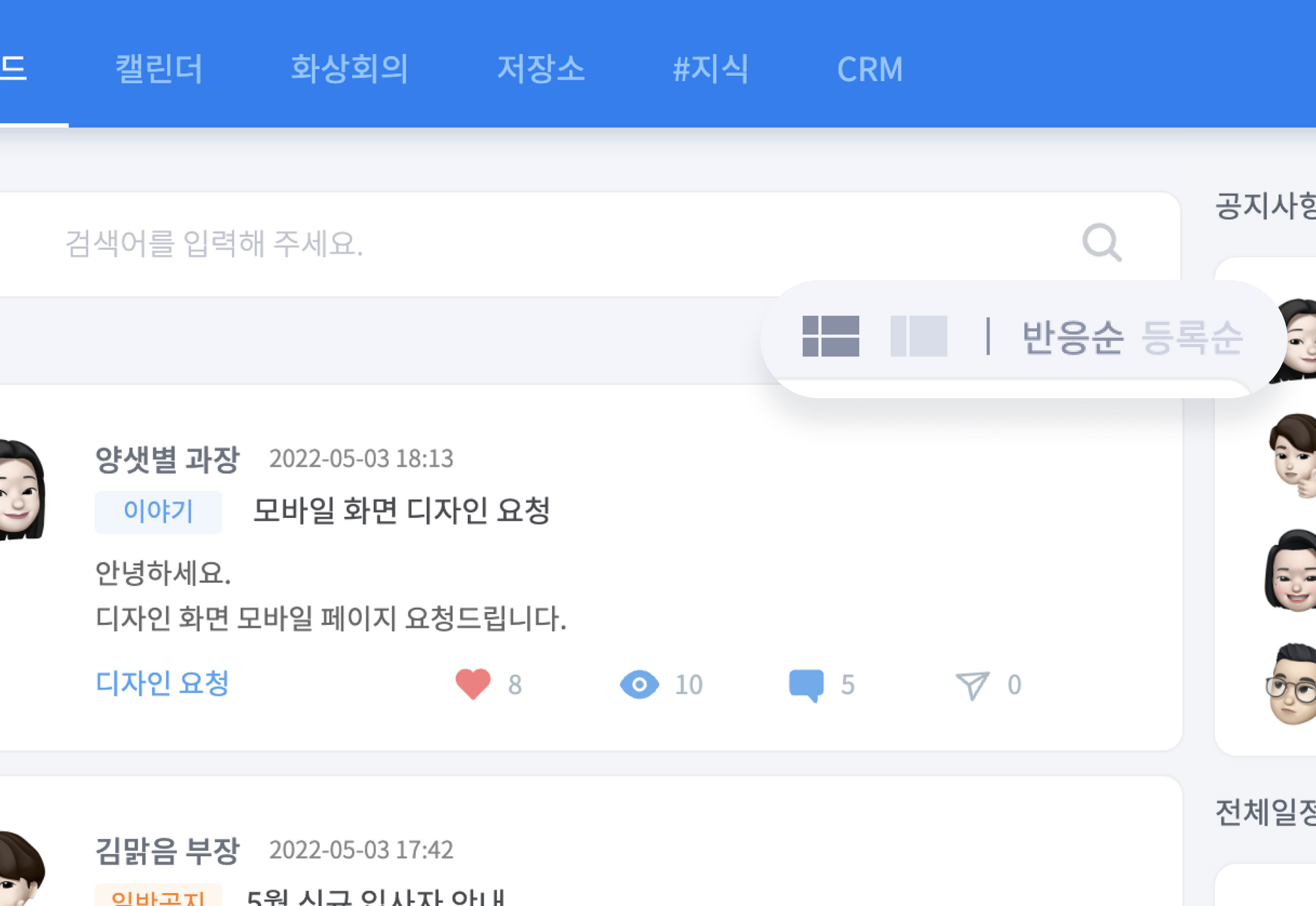 뉴스피드 보기 방식을 변경하면 작성된 글을 전부 확인할 수 있습니다. 뉴스피드 게시글 상단의 '약식형' 및 '확장형' 아이콘으로 쉽게 보기 방식을 변경해 보세요. 단, 확장형 설정 시에도 일정 게시글의 내용 전문과 첨부파일은 확인이 어렵습니다.