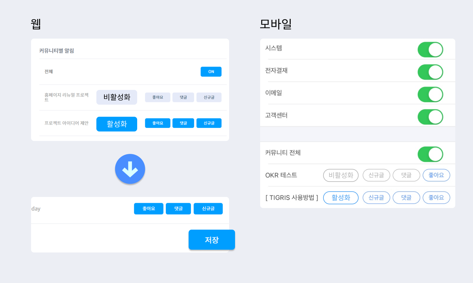 웹과 모바일에서 서비스별, 커뮤니티별 알림 설정이 가능합니다. 웹의 경우 티그리스 오른쪽 상단 설정 아이콘[⚙] - [알림설정]을 클릭하세요. 앱의 경우 하단의 [더보기] - 오른쪽 상단 설정 아이콘 [⚙] - [알림 설정]을 터치하세요. 각 커뮤니티 이름 오른쪽 신규글/댓글/좋아요 버튼을 터치해 알림을 비활성화할 수 있습니다. 파란색은 활성화 상태, 회색은 비활성화 상태입니다. 비활성화 상태인 경우 알림이 울리지 않습니다.