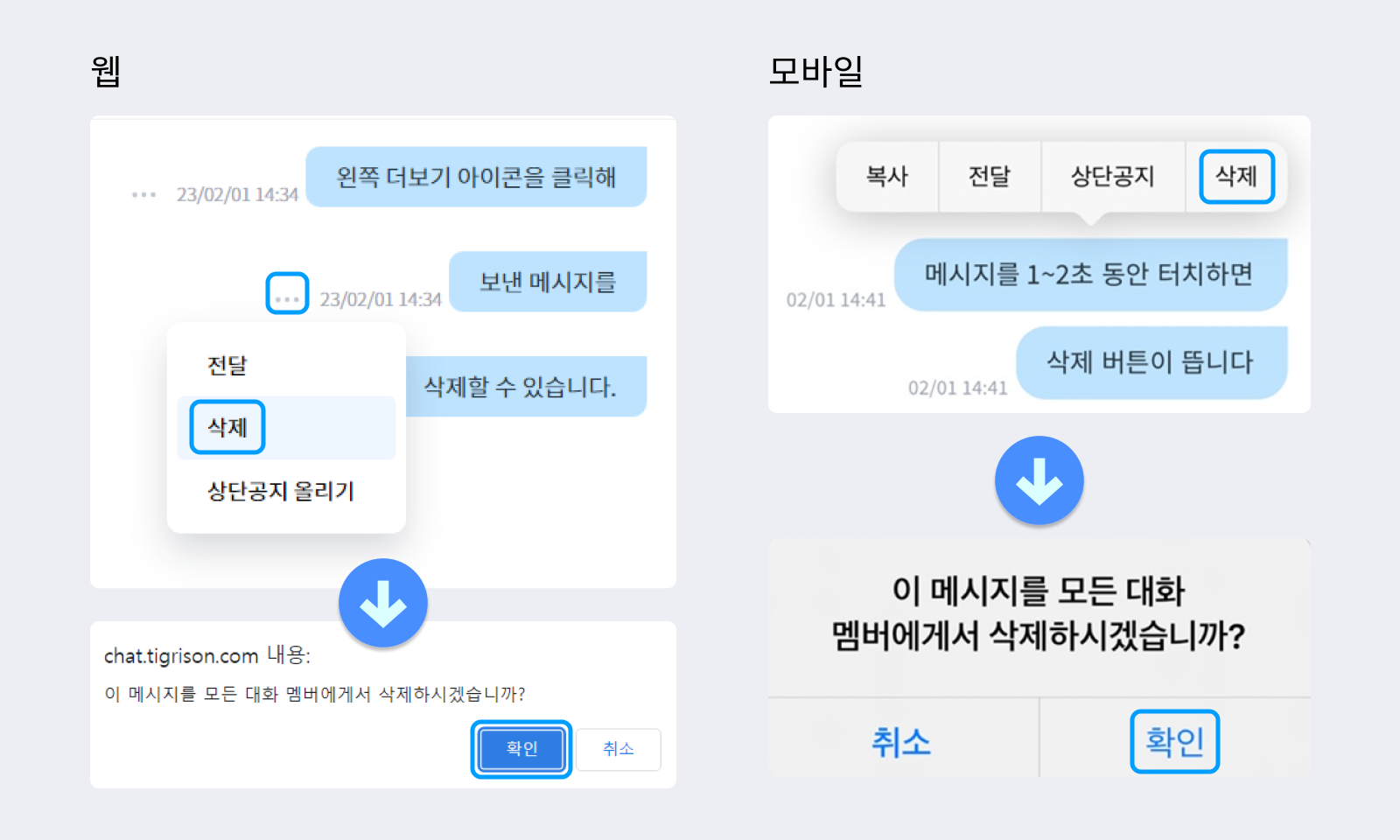 채팅창에서 보낸 메시지 왼쪽의 더보기 아이콘을 클릭해 메시지를 전달, 삭제, 상단공지 지정할 수 있습니다. 삭제를 클릭하면 보낸 메시지가 나와 상대방의 대화창에서 삭제됩니다.
