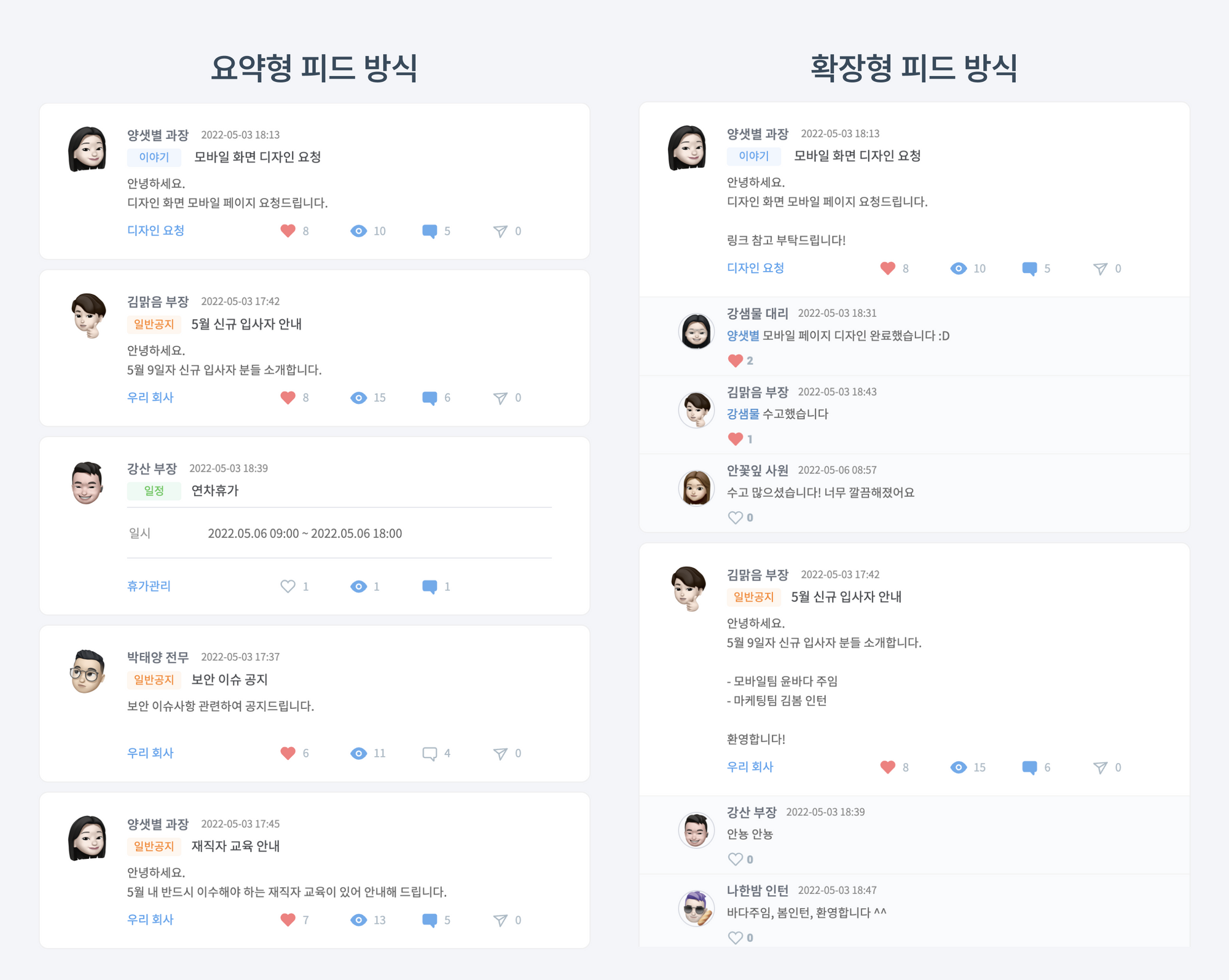 뉴스피드 보기 방식을 변경하면 작성된 글을 전부 확인할 수 있습니다. 뉴스피드 게시글 상단의 '약식형' 및 '확장형' 아이콘으로 쉽게 보기 방식을 변경해 보세요. 단, 확장형 설정 시에도 일정 게시글의 내용 전문과 첨부파일은 확인이 어렵습니다.