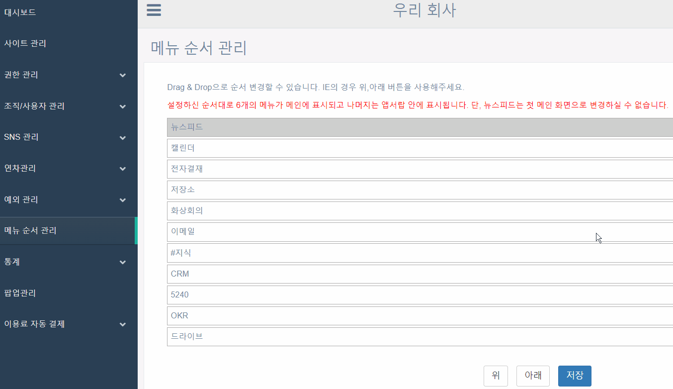 상단 메뉴 순서는 관리자가 변경할 수 있습니다. 사용자 개인은 메뉴 순서를 바꿀 수 없습니다.