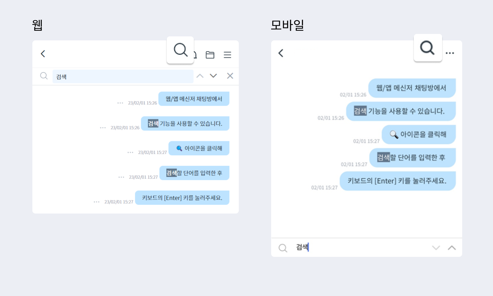 채팅창 오른쪽 상단의 검색 아이콘을 클릭해 대화 내용을 검색하실 수 있습니다. 내용 입력 후 키보드 [Enter] 키를 누르면 검색 결과가 나타납니다. 검색창 오른쪽 [∧] [∨] 아이콘을 통해 검색 위치 이동이 가능합니다.