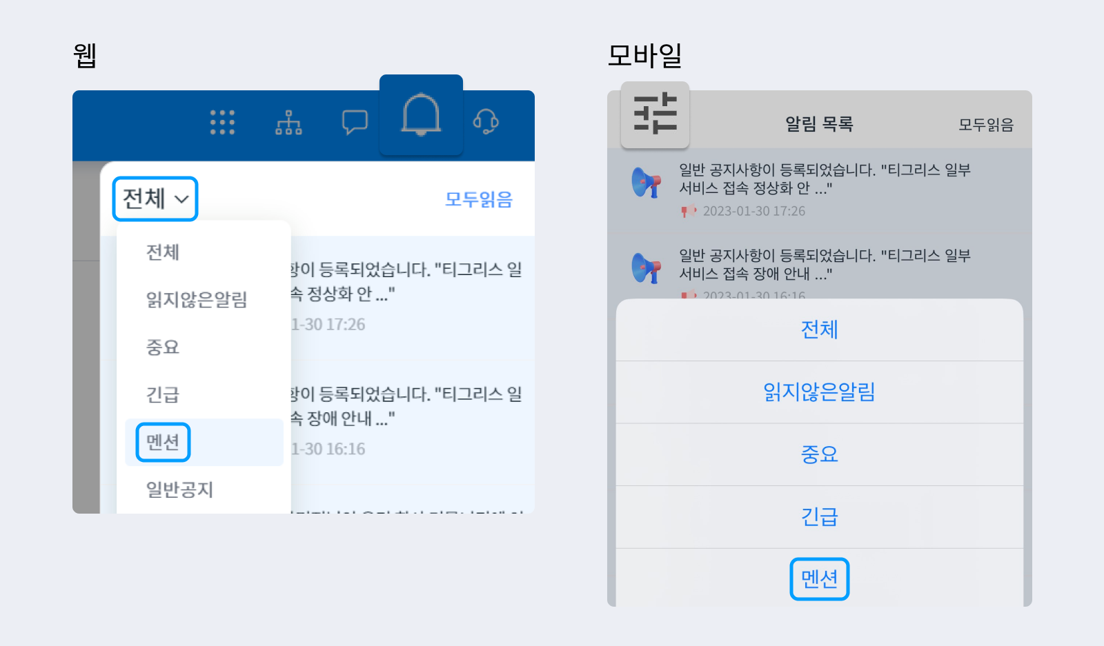 웹의 경우 알림창 왼쪽 상단의 [전체 ∨]를 클릭하면 필터가 뜹니다. 전체/읽지 않은 알림/중요/긴급/멘션/일반공지/고객센터/이메일/전자결재 등 사용 서비스에 따라 알림을 나누어 볼 수 있습니다. 멘션을 클릭하시면 사용자를 언급한 알림만 확인할 수 있습니다.