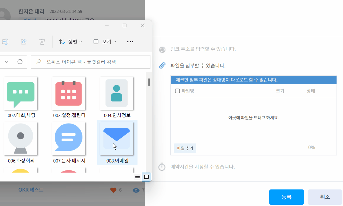 첨부파일을 드래그 앤 드롭 방식으로 추가할 수 있습니다. [글쓰기] 창에서 [파일을 첨부할 수 있습니다.]를 클릭하세요. 폴더에서 파일을 끌어다 놓으면 파일이 추가됩니다.