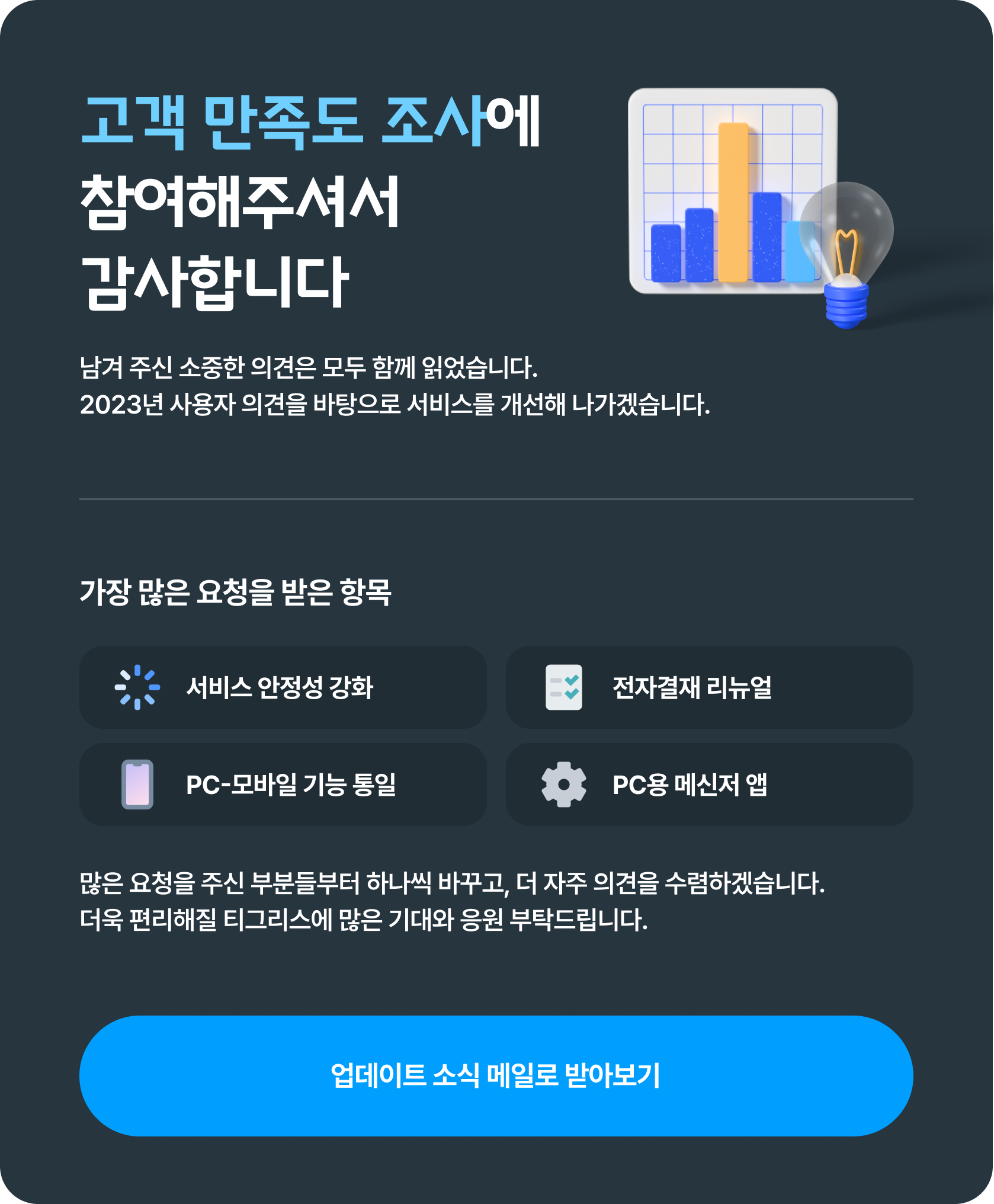 2023년에는 만족도 조사를 통해 주신 의견을 토대로 전반적인 안정성 및 사용성 강화, 전자결재 리뉴얼, 모바일 기능 강화, PC용 메신저 프로그램 개발 등을 추진할 계획입니다. 요청 우선순위, 개발에 소요되는 시간 등을 고려해 점차 개선해 나갈 예정이니 2023년 달라질 티그리스를 기대해 주세요!