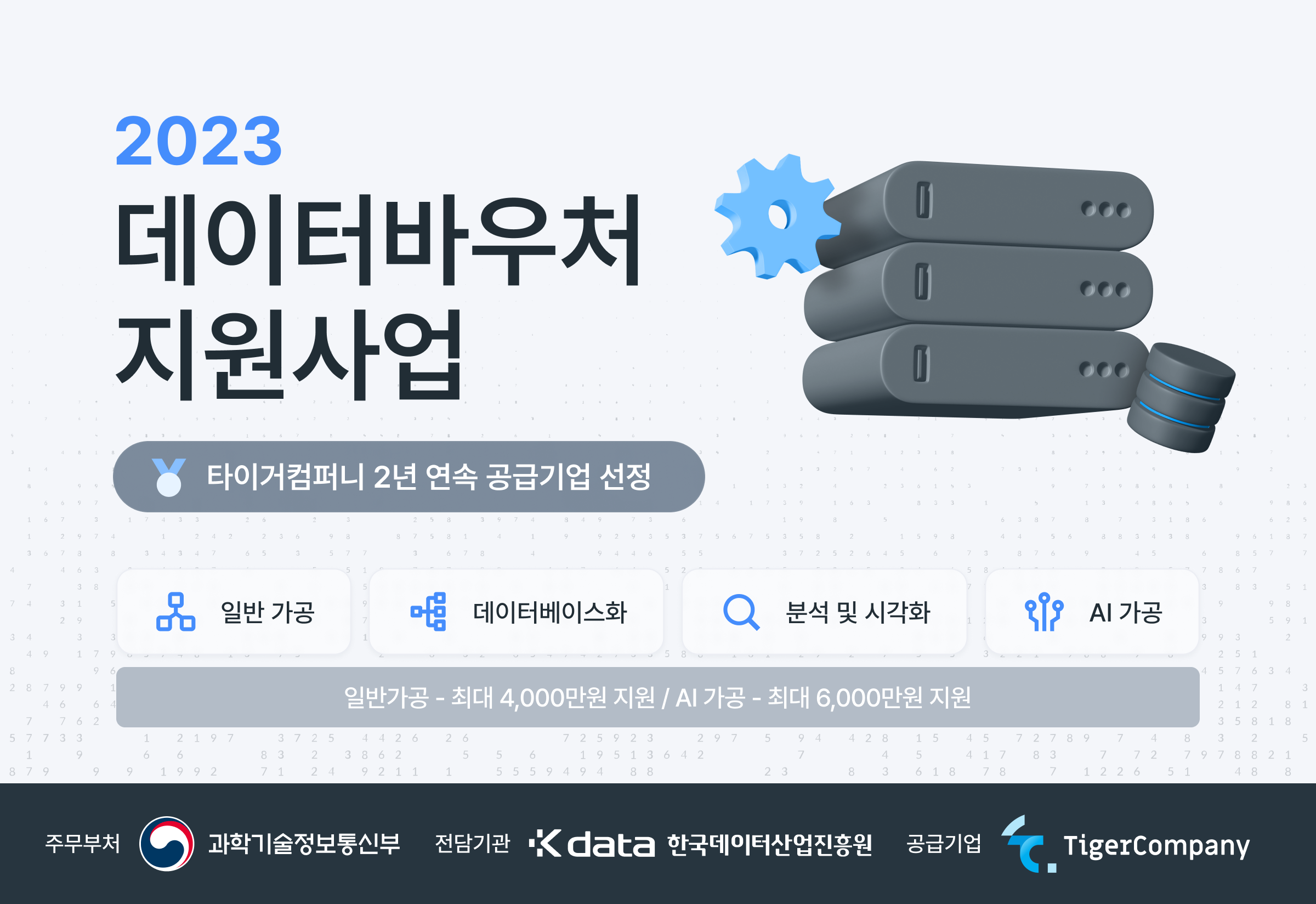 타이거컴퍼니(대표 김범진)가 오는 3월 말까지 '2023년 데이터바우처 지원사업'에 참여할 기업을 모집한다고 9일 밝혔다.
