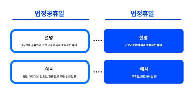 법정공휴일은 ‘관공서 공휴일에 관한 규정’에 따라 보장하는 휴일이고, ‘법정휴일’은 근로기준법에 따라 보장하는 휴일’이라는 점이