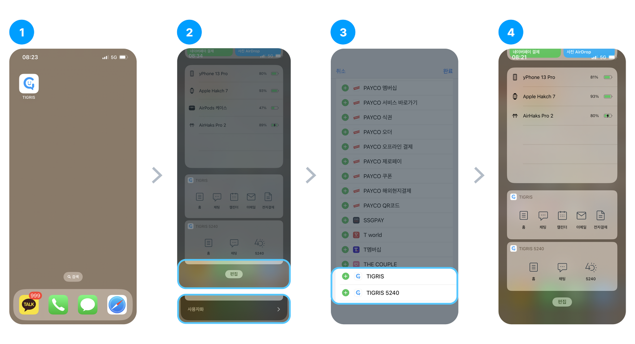 아이폰 위젯 페이지에서 티그리스, 티그리스5240 위젯을 추가할 수 있습니다. 아래 방법을 따라 차근차근 위젯을 추가하세요.
