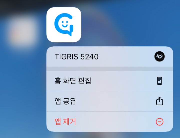 설치된 앱을 1~2초간 꾹 터치한 후 [TIGRIS 5240]을 선택하면 바로 출퇴근 체크 화면으로 이동합니다.