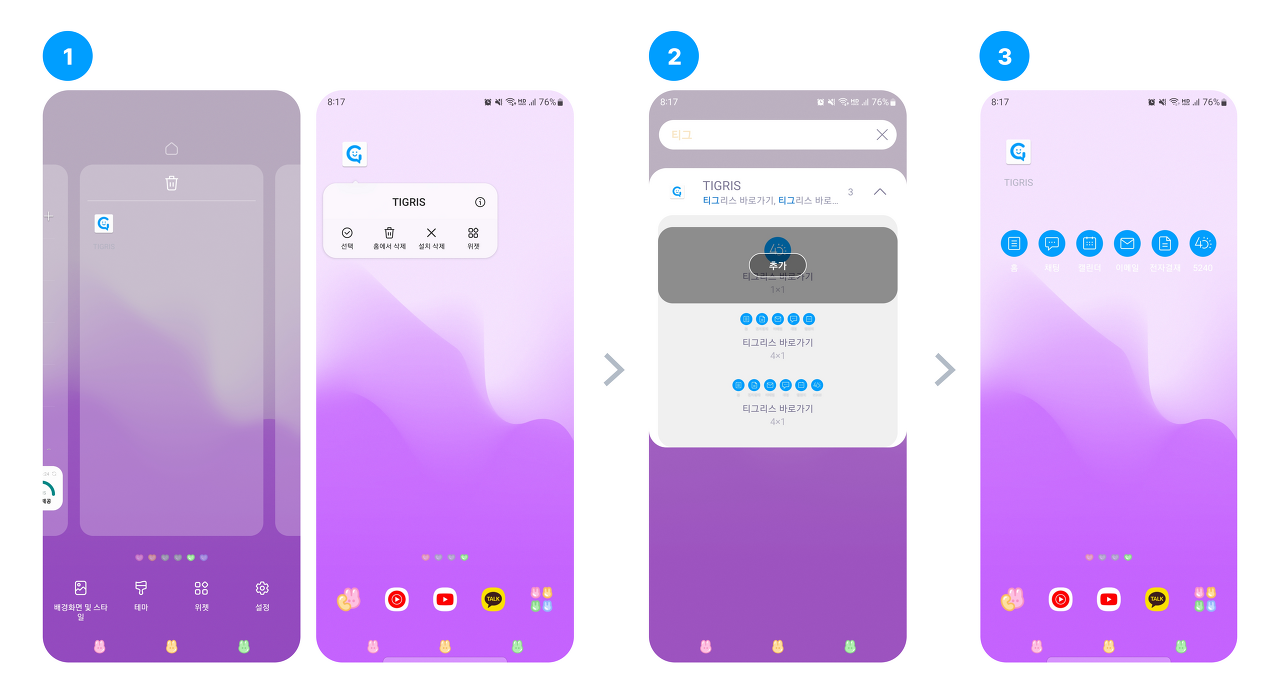 안드로이드 위젯 기능을 통해 티그리스, 티그리스 5240 위젯을 추가할 수 있습니다. 아래 방법을 따라 차근차근 위젯을 추가하세요.