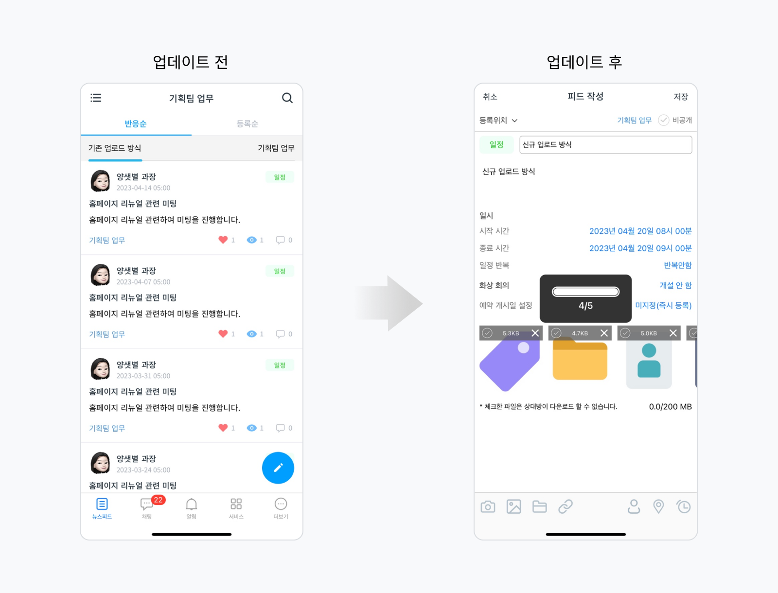 기존에는 피드에 게시물을 등록할 때 백그라운드에서 진행되었습니다. 모바일팀은 작성 화면에서 모든 처리가 이루어지고, 글이 정상적으로 등록된 후에 화면을 닫는 방식으로 업데이트를 진행했는데요.