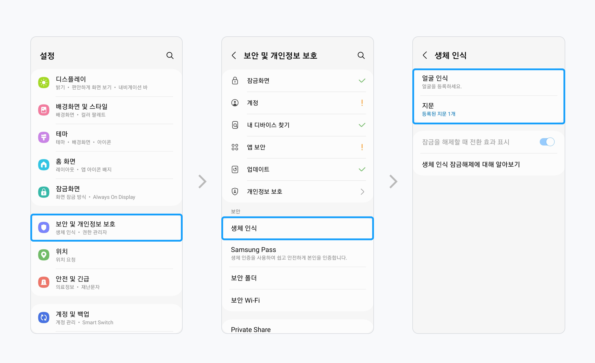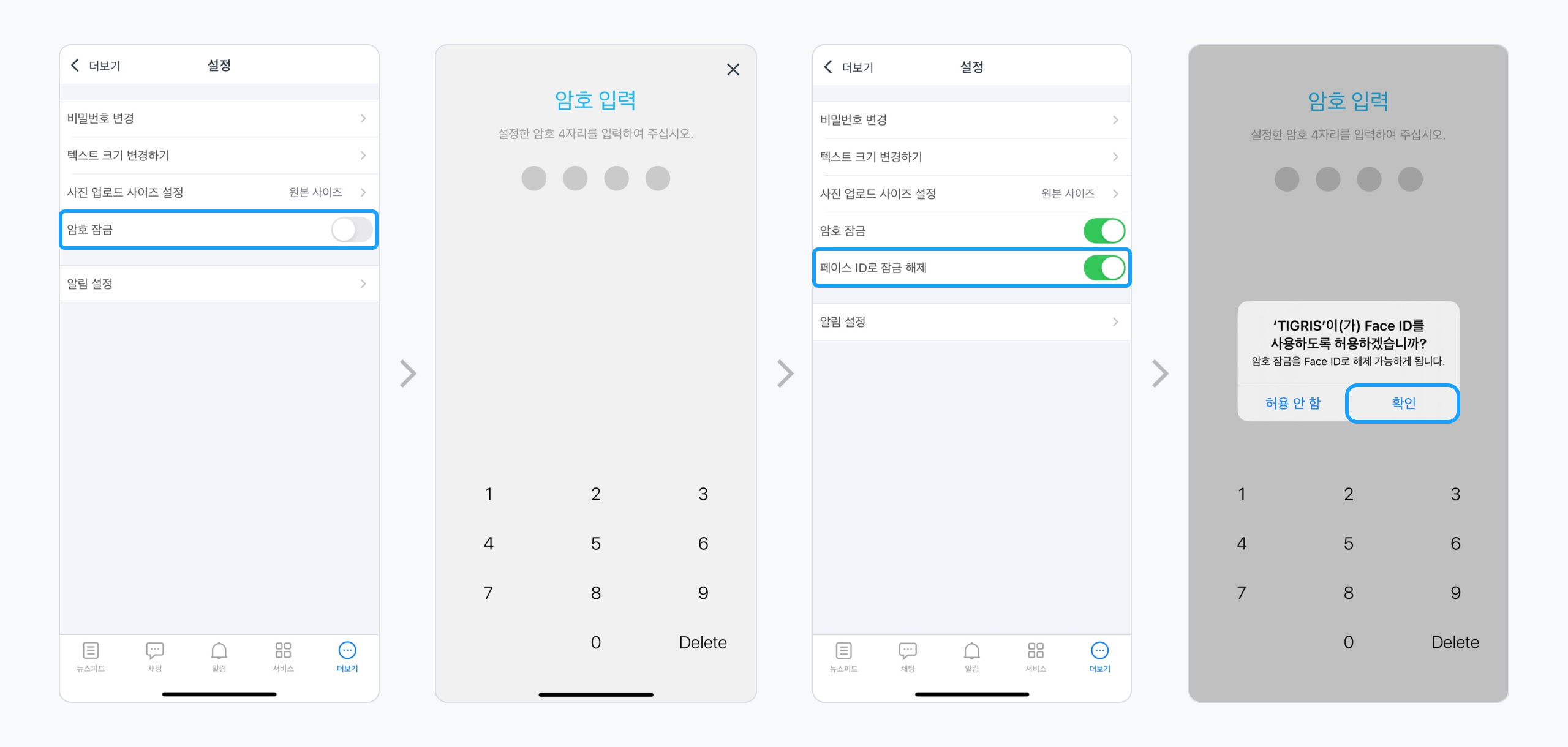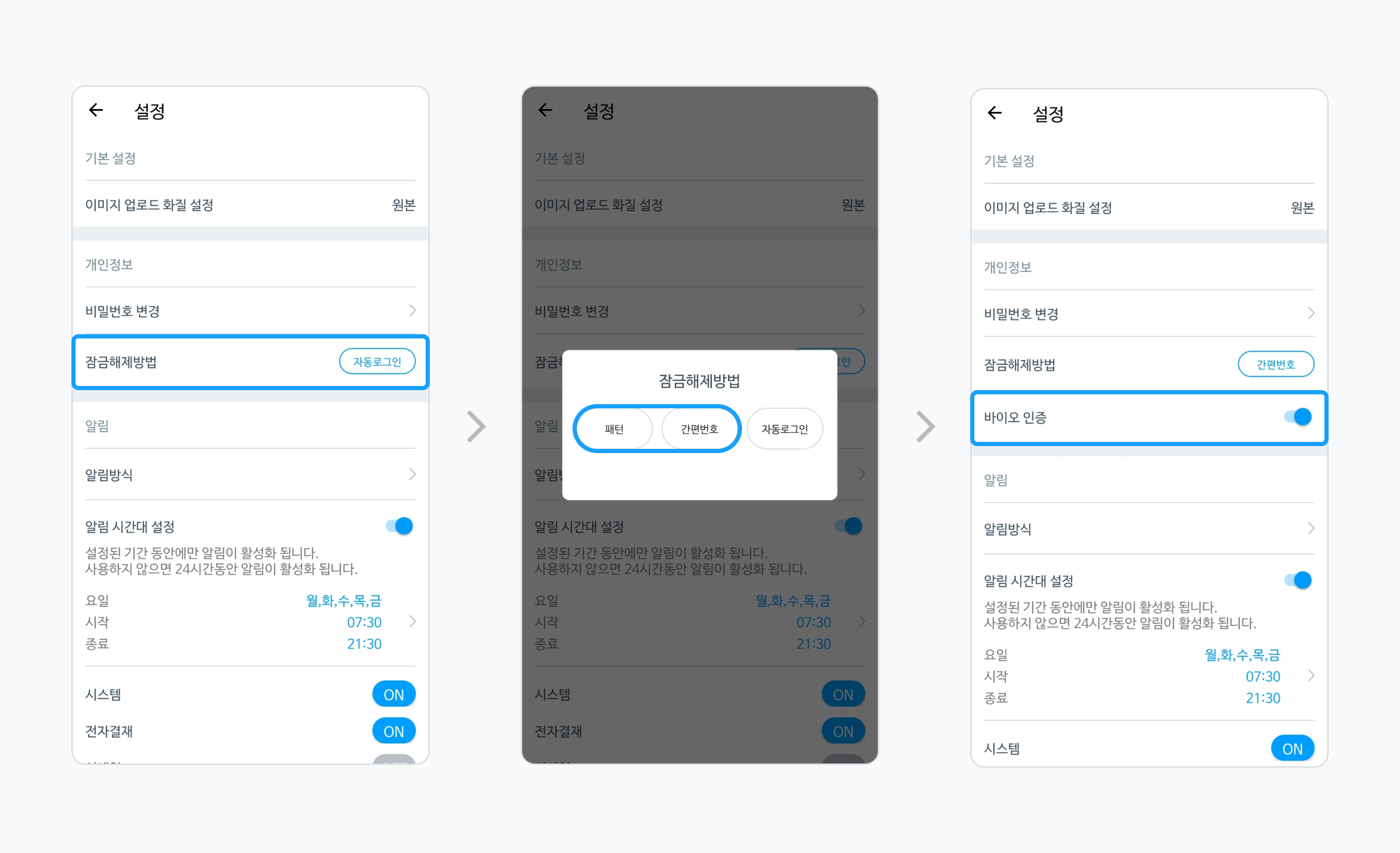 잠금 설정을 켠 후 바이오 인증을 사용해 더욱 안전하게 앱을 사용해 보세요. 기존에 간편번호와 패턴으로 잠금 설정을 사용했다면, 바이오 인증을 바로 활성화할 수 있습니다.