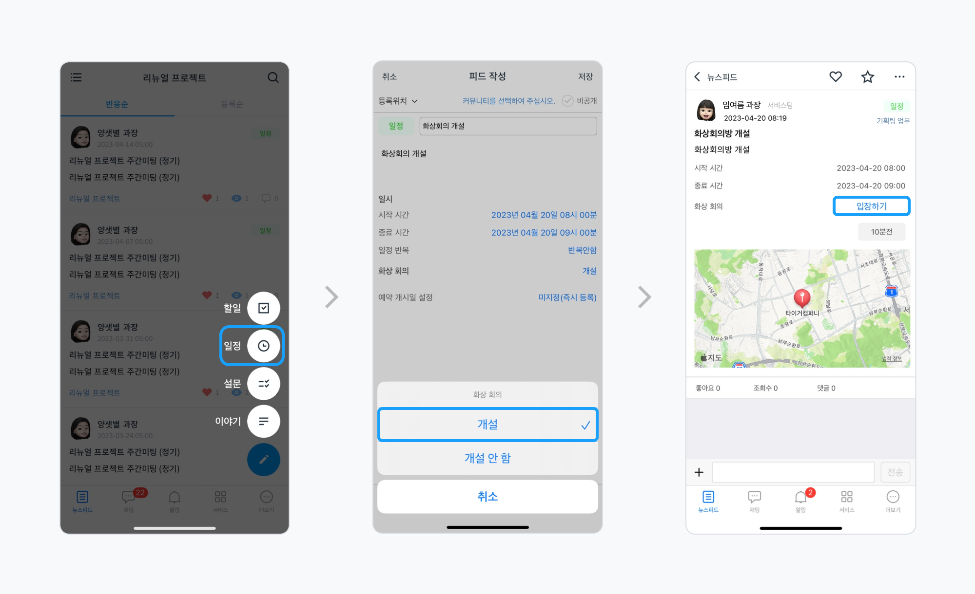 등록 방식을 변경하면서 동시에 모바일 일정 게시물에서 바로 화상회의방을 개설할 수 있게 되었습니다.