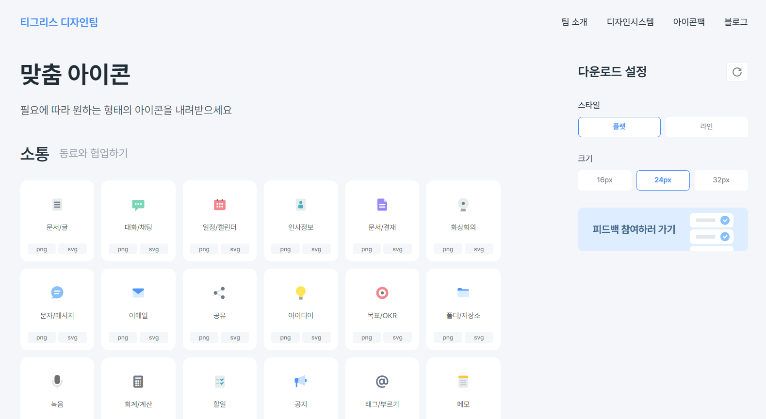 기본 세트에는 플랫 아이콘과 두 가지 색상(블랙/화이트)의 라인 아이콘이 포함되어 있습니다. 아이콘 스타일을 지정해 개별 다운로드하는 것도 가능합니다. 디자인팀 홈페이지 아이콘 팩 페이지에서 '맞춤 아이콘 받기'를 클릭해 보세요. 플랫 스타일은 세 가지 크기(16px, 24px, 32px)를 선택할 수 있고, 라인 스타일은 크기와 함께 색상을 지정해 다운로드할 수 있습니다.