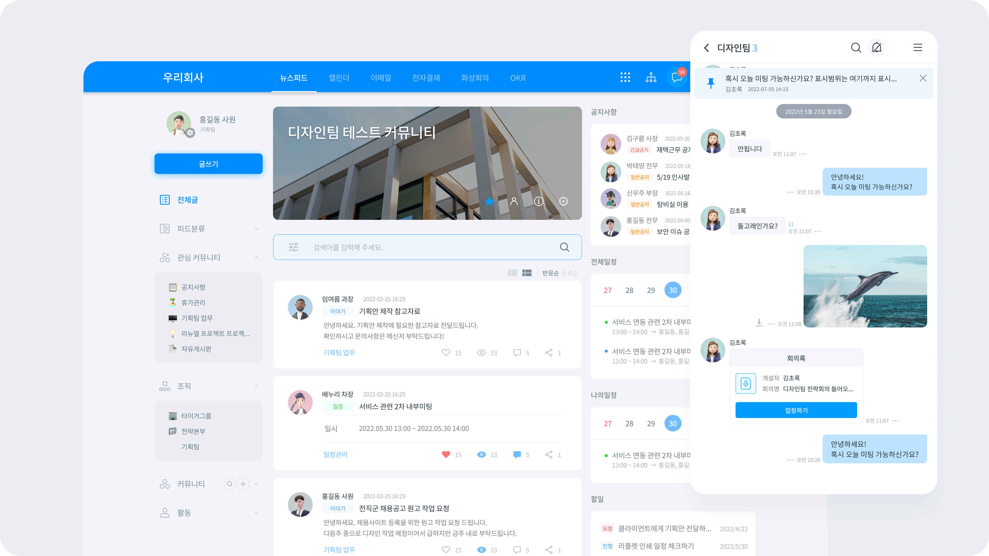 뉴스피드, 캘린더, 메신저에서 바로 사용 가능한 화상회의로 비대면 환경에 대비하세요! 일정 게시물과 메신저에서 바로 화상회의방을 개설하고 입장할 수 있습니다.