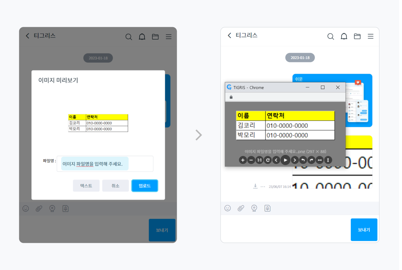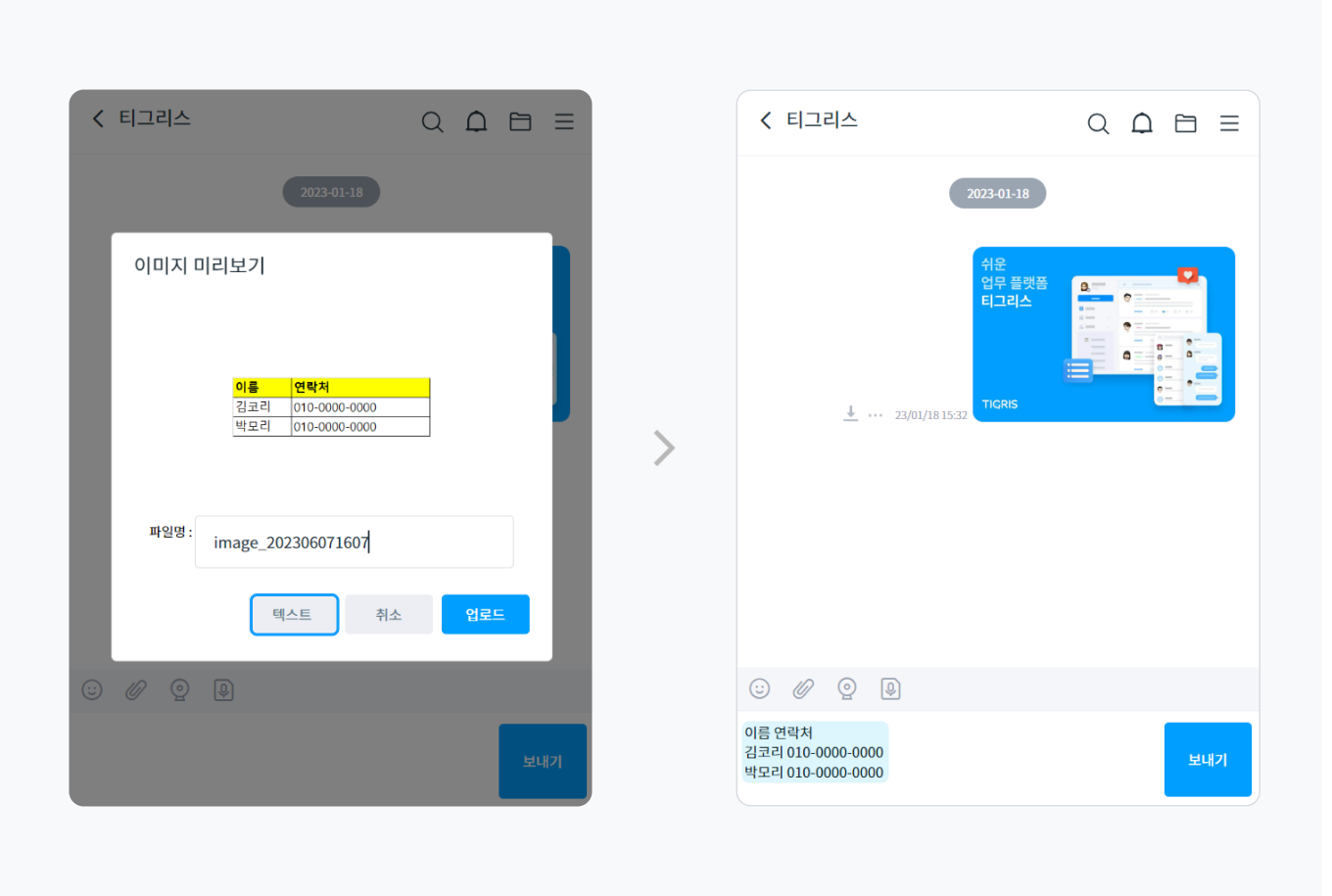 지난 만족도 조사에서 메신저에서 엑셀 내용을 복사-붙여넣기할 때 이미지로만 전송돼 불편하다는 사용자 의견이 있었는데요. 이번 업데이트를 통해 텍스트 선택 기능을 추가했습니다.