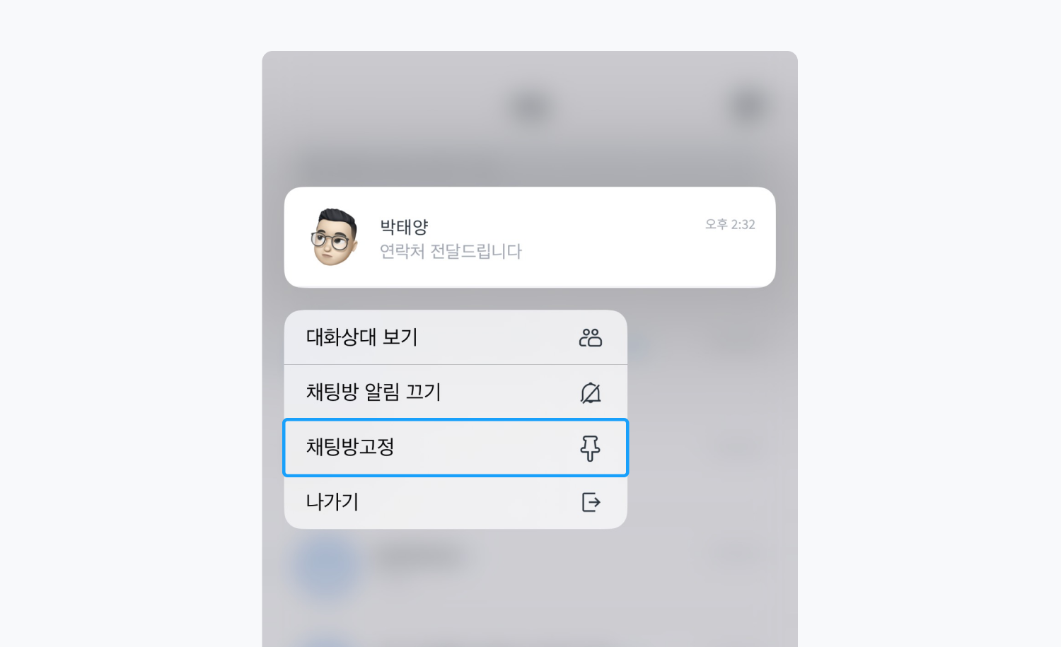 채팅방 고정을 해제하고 싶을 땐 같은 방법으로 메뉴를 열어 [채팅방 고정 해제]를 선택해 주세요.
