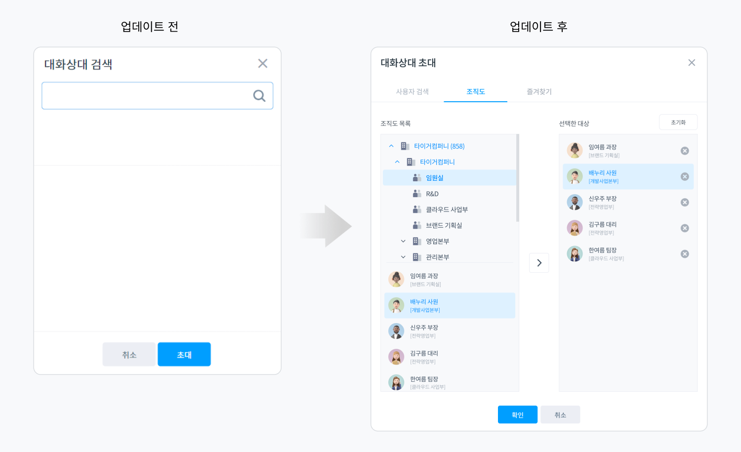 새로운 기능을 활용해 여러 부서 또는 많은 인원을 초대할 때 더 빠르게 채팅방을 개설해 보세요!