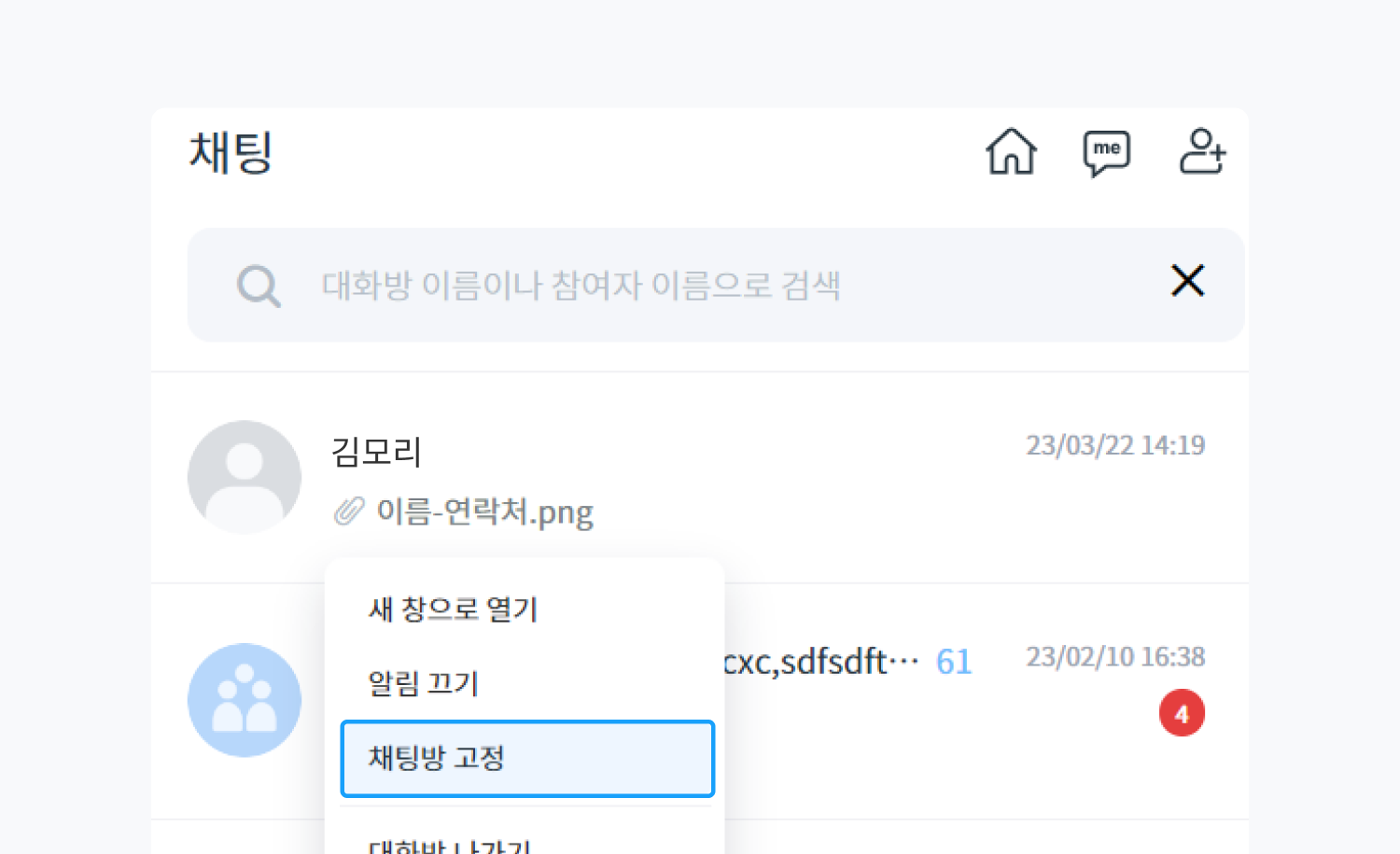 웹과 모바일 메신저에 채팅방 고정 기능을 추가했습니다. 이제 메신저 채팅방 목록에서 자주 사용하는 채팅방을 상단에 고정해 더 신속하게 대화할 수 있습니다.