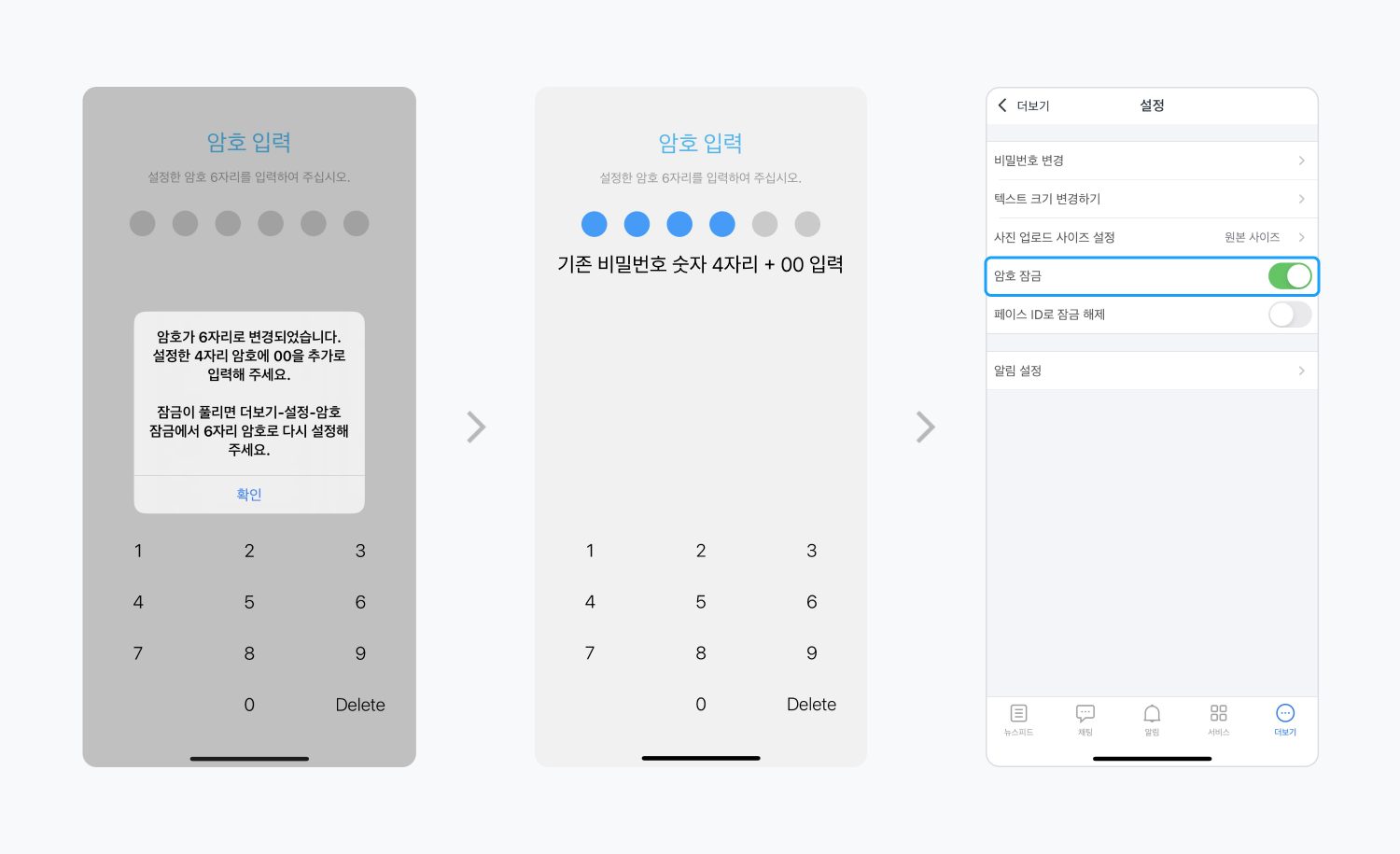더 안전한 환경을 제공하기 위해 앱 잠금 암호를 4자리 숫자에서 6자리 숫자로 변경했습니다. 기존에 4자리 숫자 암호를 사용 중인 경우 앱 업데이트 후 안내창이 나타납니다. 안내를 따라 차근차근 6자리 숫자로 암호를 재설정해 주세요.